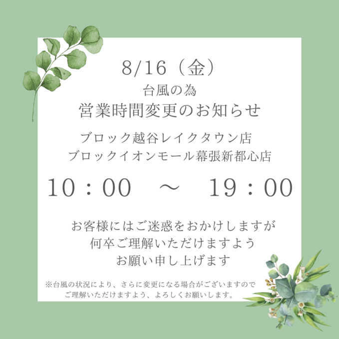 8月16日、台風接近の為、越谷店・幕張新都心店の営業時間を