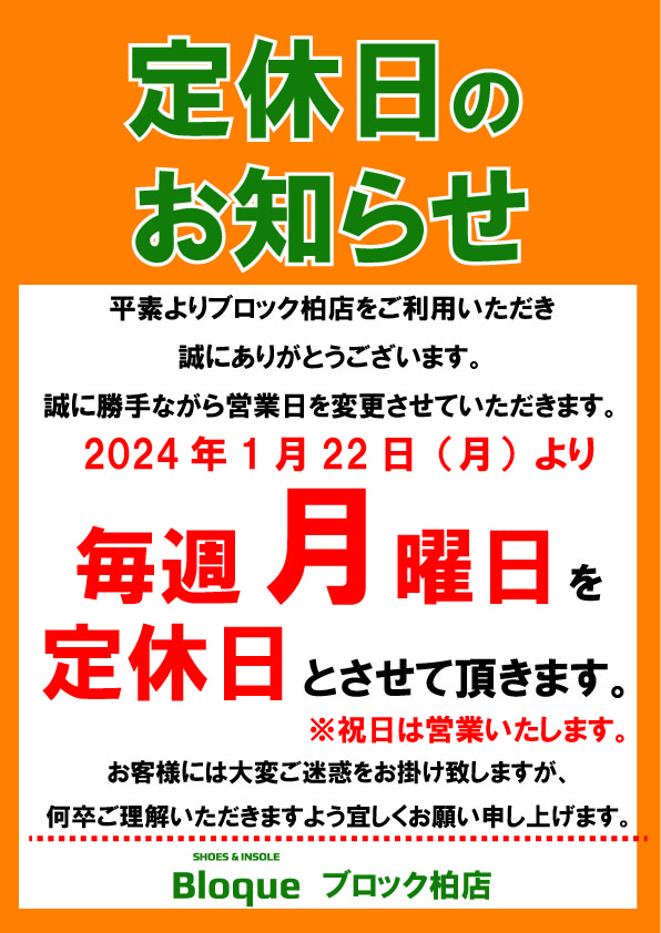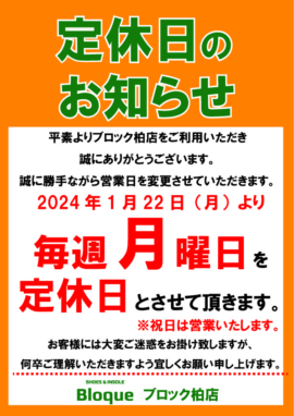 柏店 営業日変更のお知らせ